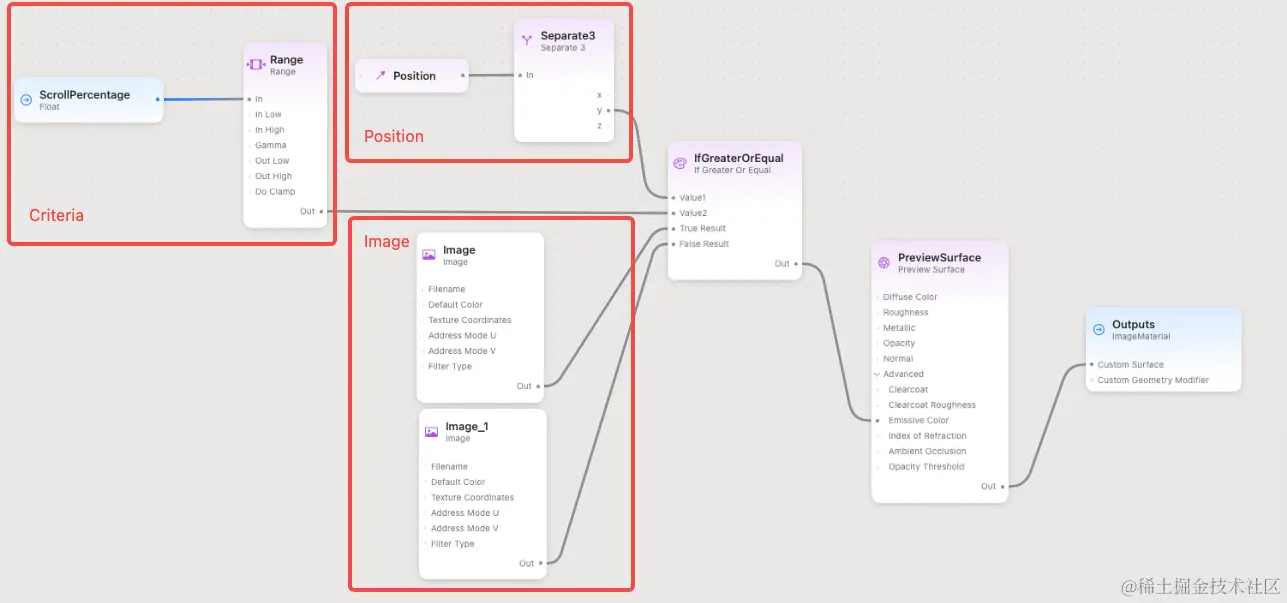 - IfGreaterOrEqual 节点:串联上前面 3 个部分,对比渲染点的 y 坐标(Position 部分)和分界线(Criteria 部分),并选择其中一幅图作为渲染结果。