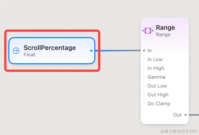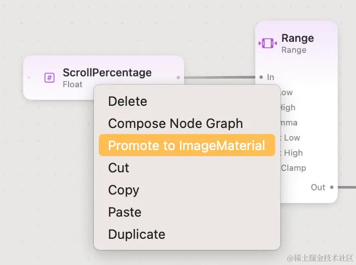 - Criteria 部分:用来控制两幅图交界的位置,y 坐标大于特定值展示一幅图,否则展示另一幅图。输入采用了 Float 节点,用于控制分界值,输入的值用 0-100 的百分比表示。另外用 Range 节点做了一层映射,将百分比转换成实际的坐标值。这里有一个关键步骤,如果想要后续通过代码控制 Float 节点数值,需要将该节点“Promote”,相应地其颜色也会从淡紫色变为淡蓝色。