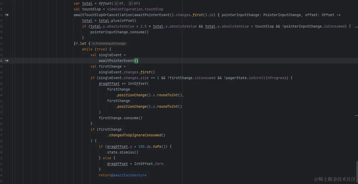当在y上移动的增量大于x移动的增量的2倍,并且大于touchSlop ,表示我们就要消费事件执行下拉拖拽隐藏界面了。up时,当在y轴拖动正向距离超过100dp隐藏界面,否则回到原来的位置。