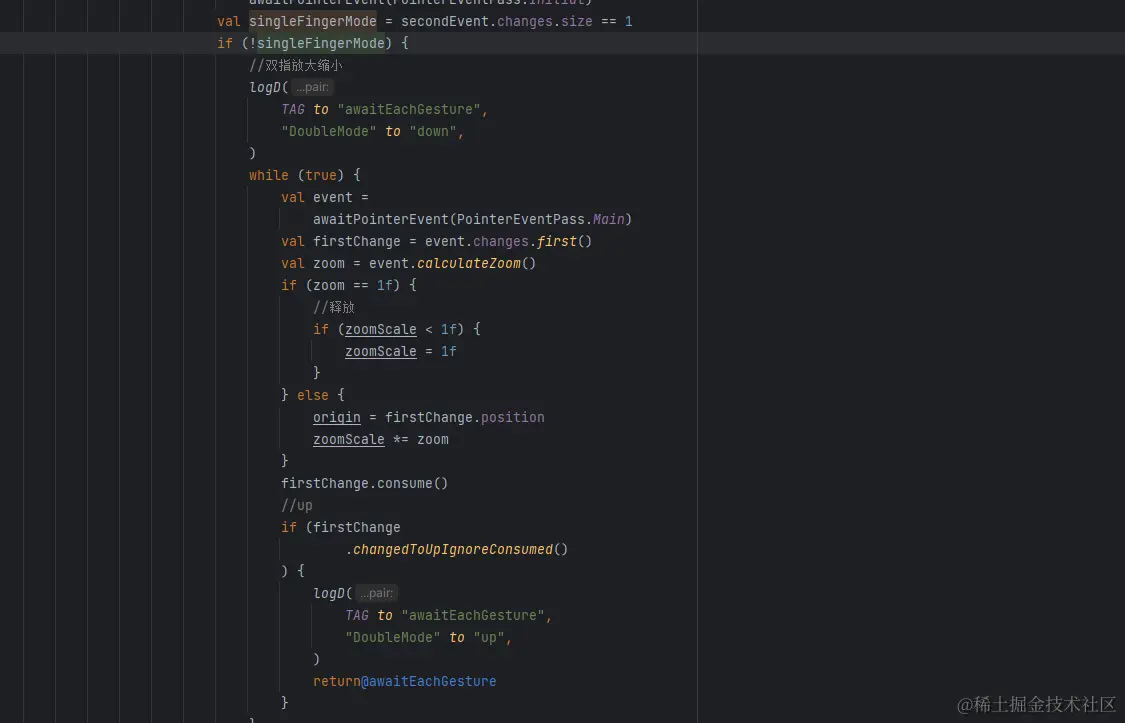可以通过changes 来判断当前有几根手指头按下,如果为2就是双指了,然后通过compose 提供的calculateZoom 方法就可以知道双指操作放大或缩小的值了。