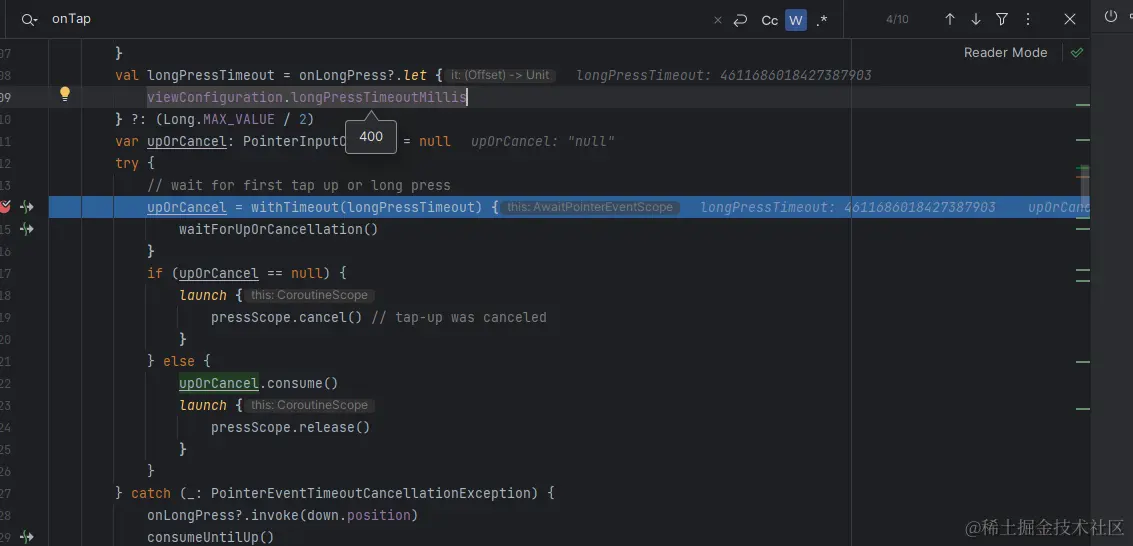长按事件其实是通过协程的取消机制来做的,超过400ms 后超时会自动触发协程的cancel,然后会进入异常catch块触发长按事件。如果没超过,在400ms内再来了一次事件就会触发双击事件,如果400ms内只来了一次事件就会触发单击事件。