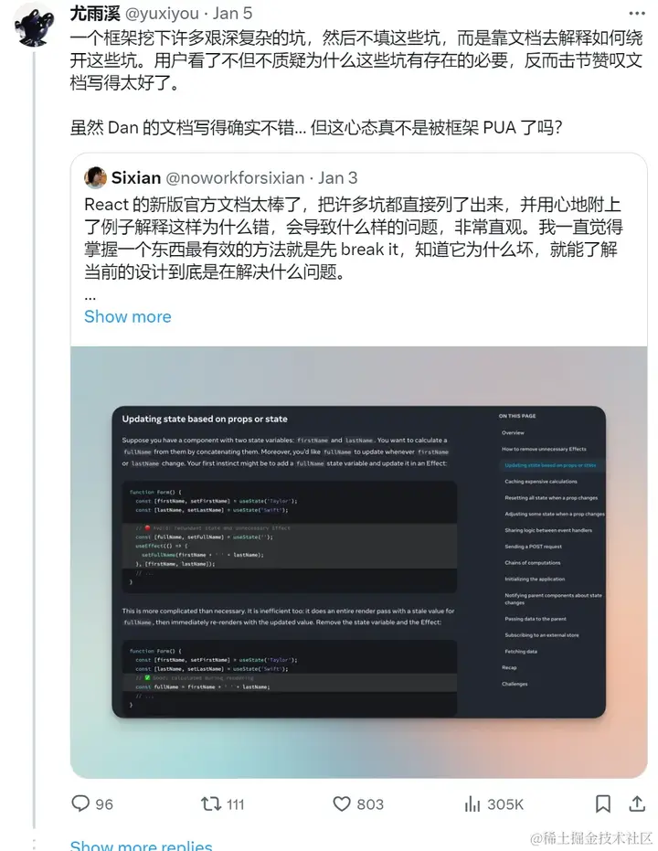 但是,作为一个被React浸染多年的开发者而言,从心底里发出感叹,React的心智模式真的很大,对于新手来说需要克服的东西还真不少。虽然它作出了很多优化的措施,但是它前期的设计思路已经禁锢它接下来的路。就像尤雨溪所说,不否认早期的React在对前端框架的设计有一种创造性的突破,但是随着浏览器各项原生API的突破,让我们在设计前端框架时候,有了另外的可能。