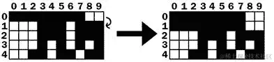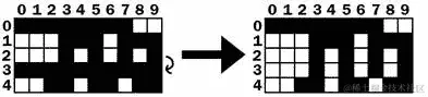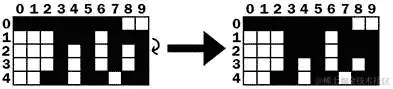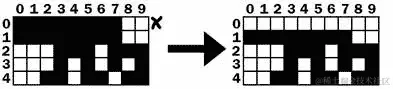 让我们看下面的例子。为了节省空间,只显示了棋盘的前五行。第 3 行是一个完整的行,这意味着它上面的所有行(第 2、1 和 0 行)都必须被“拉下”。首先,第 2 行被复制到第 3 行。右边的棋盘显示了在完成此操作后棋盘的样子: