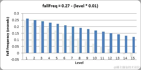 在上述情况下,方块每个级别下落的速度只会比原来快 0.01 秒,而不是 0.02 秒。图表会是这样的(原始线条也在图表中以浅灰色显示):