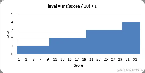 计算级别时,我们使用int()函数将分数除以10后向下取整。因此,如果分数在0和9之间,int()调用将将其舍入为0。代码中的+ 1部分是因为我们希望第一个级别是级别 1,而不是级别 0。当分数达到10时,int(10 / 10)将计算为 1,+ 1将使级别为 2。下面是一个图表,显示了分数为 1 到 34 时的级别值:
