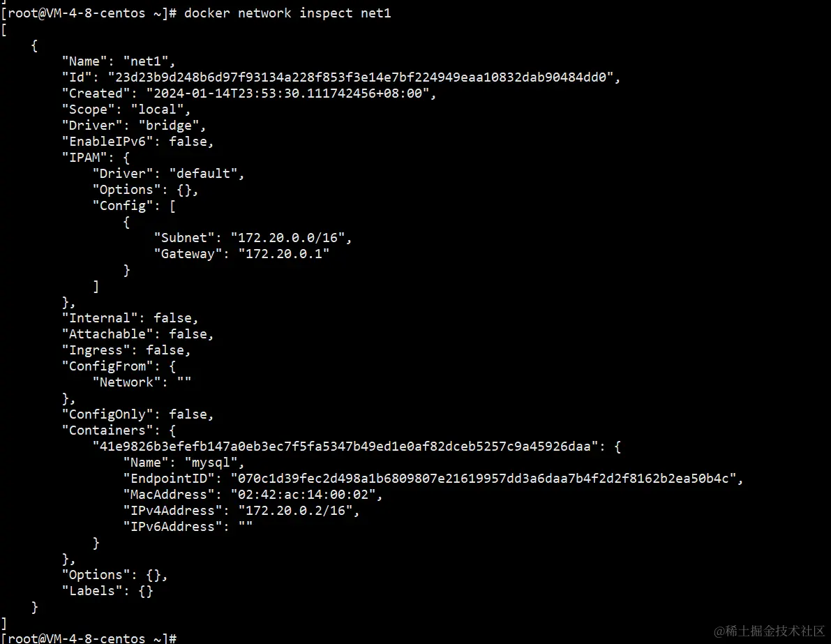 使用命令查看我们的net1里面有没有我们的mysql,在最下面的containers有