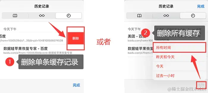 步骤3:如果只想删除某些记录,那么直接在该记录上右滑单击**【删除】即可。如果想删除所有缓存,您可以单击右下角的【清除】按钮,然后选择【所有时间】**就能一键清空这些数据。