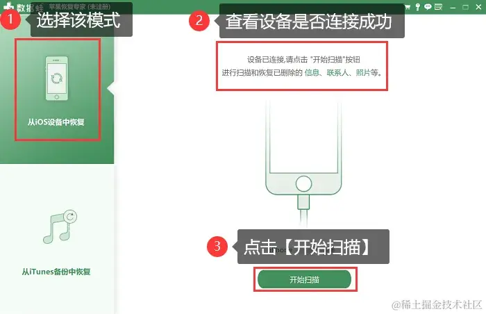 步骤2:在软件上选择**【从iOS设备中恢复】模式,确保已经连接好手机后点击【开始扫描】**按钮,等待软件扫描完成。