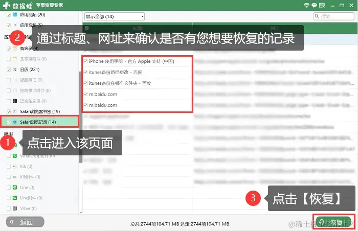 步骤3:在扫描结果中,找到并选择需要恢复的Safari浏览记录,然后点击**【恢复】**,即可将恢复的记录保存到电脑上。
