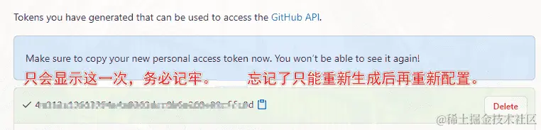 token只会显示这一次,之后将无法查看,所以务必保证你已经记录下了Token。之后如果忘记了就只能重新生成重新配置了。