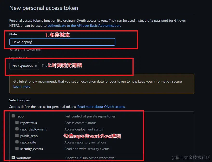 在主页依次选择【Settings】-【Developer settings】-【Personal access tokens】-【Tokens(classic)】-【Generate new token】- 【Generate new token(classic)】,填写好描述,勾选【repo】和【workflows】,然后点击【Generate token】生成一个Token。