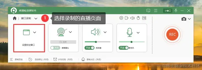 步骤2:在窗口录制页面中,选择需要录制的直播页面,调整好录制的范围后,点击右边红色 “REC” 按钮开始录屏。