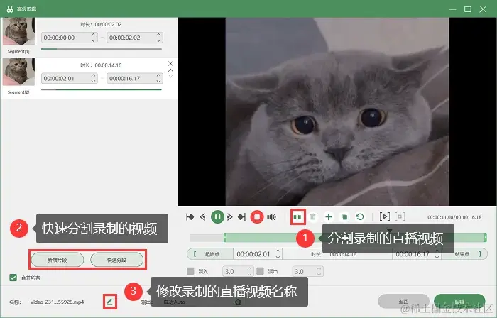 步骤4:如果您不小心分段录制了多个直播视频,可以来到历史记录页面,选中这些视频,把它们合并成一个完整的视频。