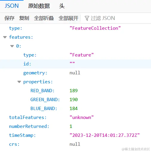 此时,浏览器会返回一个JSON,描述了该像素位置的几何信息,其关联的属性信息,以及一些元数据信息。如下图所示: