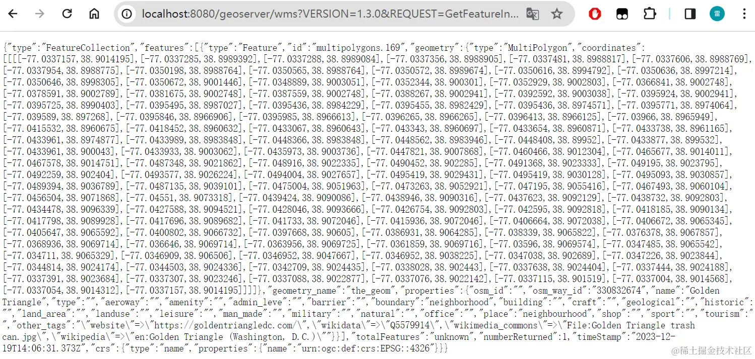 我们按照表4所示的参数来查询前文中配置好的基于矢量数据集的地图,具体在某个像素位置的要素信息,可以在浏览器中输入如下地址: