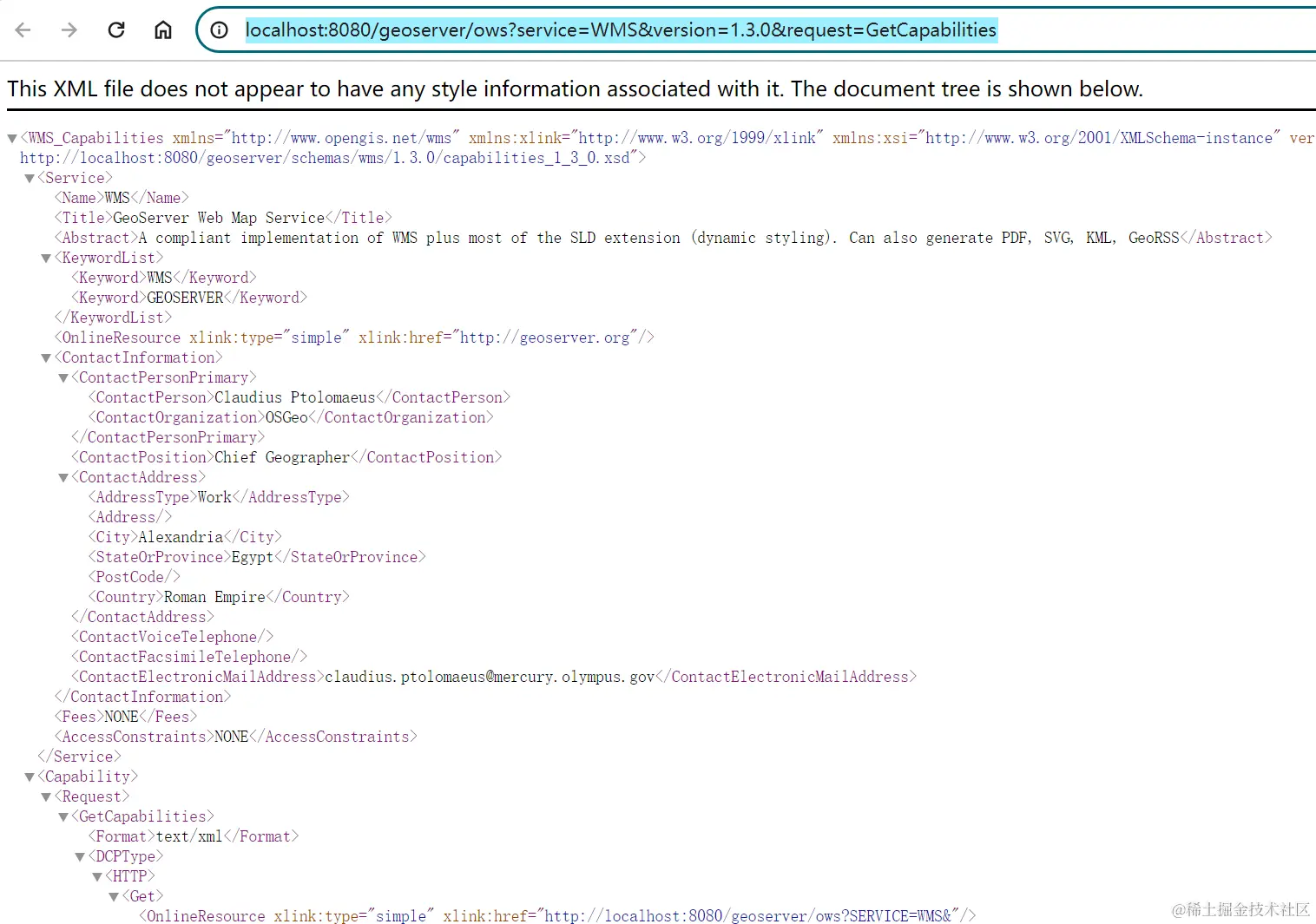 浏览器响应的结果如下图所示。可以看到返回的结果其实是一个XML文件,这个文件中描述的就是WMS服务具体的元数据信息。