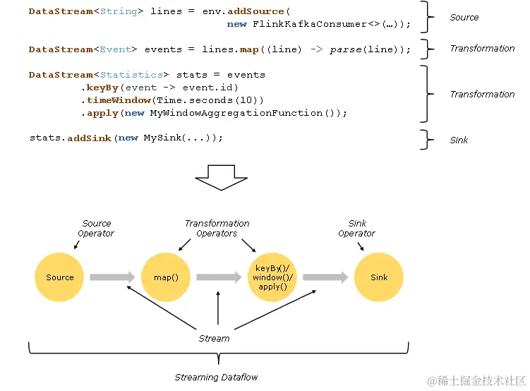 Flink 程序看起来像一个转换 DataStream 的常规程序。每个程序由相同的基本部分组成: