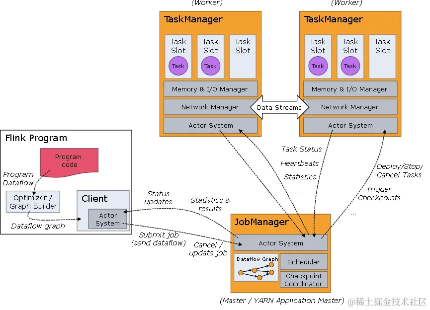 Flink 是一个分布式系统,需要有效分配和管理计算资源才能执行流应用程序。它集成了所有常见的集群资源管理器,例如Hadoop YARN,但也可以设置作为独立集群甚至库运行。Flink 运行时由两种类型的进程组成:一个 JobManager 和一个或者多个 TaskManager。