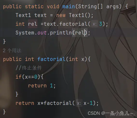 - 基线条件:递归方法必须包含一个基线条件(也称为终止条件),用于终止递归的执行。