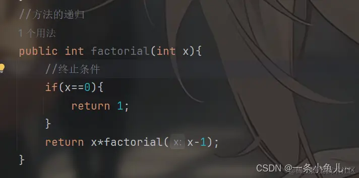 如图该方法实现了求一个数的阶层,在递归调用自己的方法从而完成问题求解;