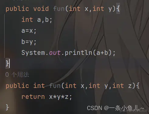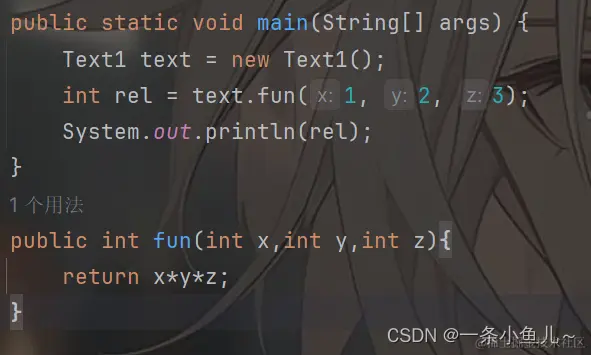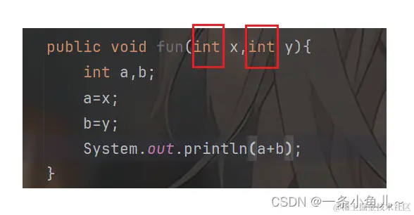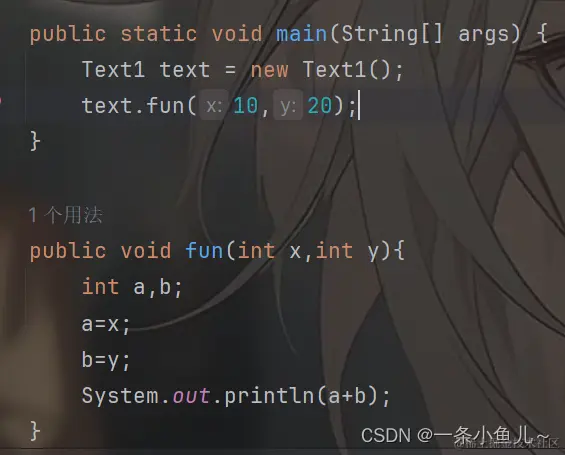 如图我们这样就将两个int类型的参数放在方法中了,在使用时传入我们的x和y的值即可;