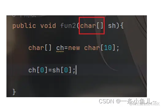 如图我们将字符char类型的sh数组传入方法,内部创建了一个ch数组将sh数组的[0]下标赋值给ch[0] 下标;