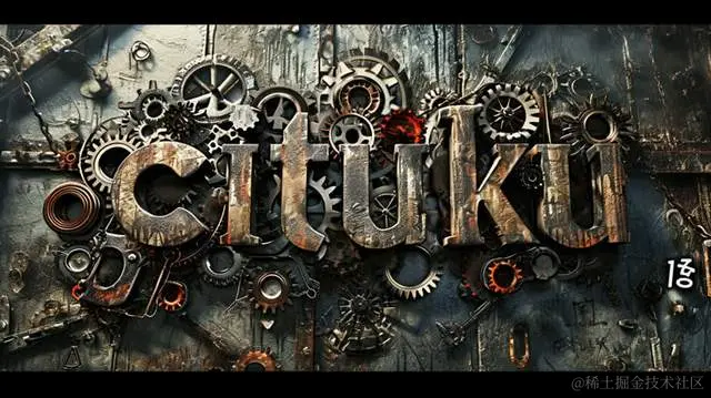 带有cituku字母的齿轮背景,风格融合了现实和奇幻元素、生锈的碎片、真实的人体描绘,结合了#screenshotsaturday、创意共用属性、手写字体、当代奇异风格。
