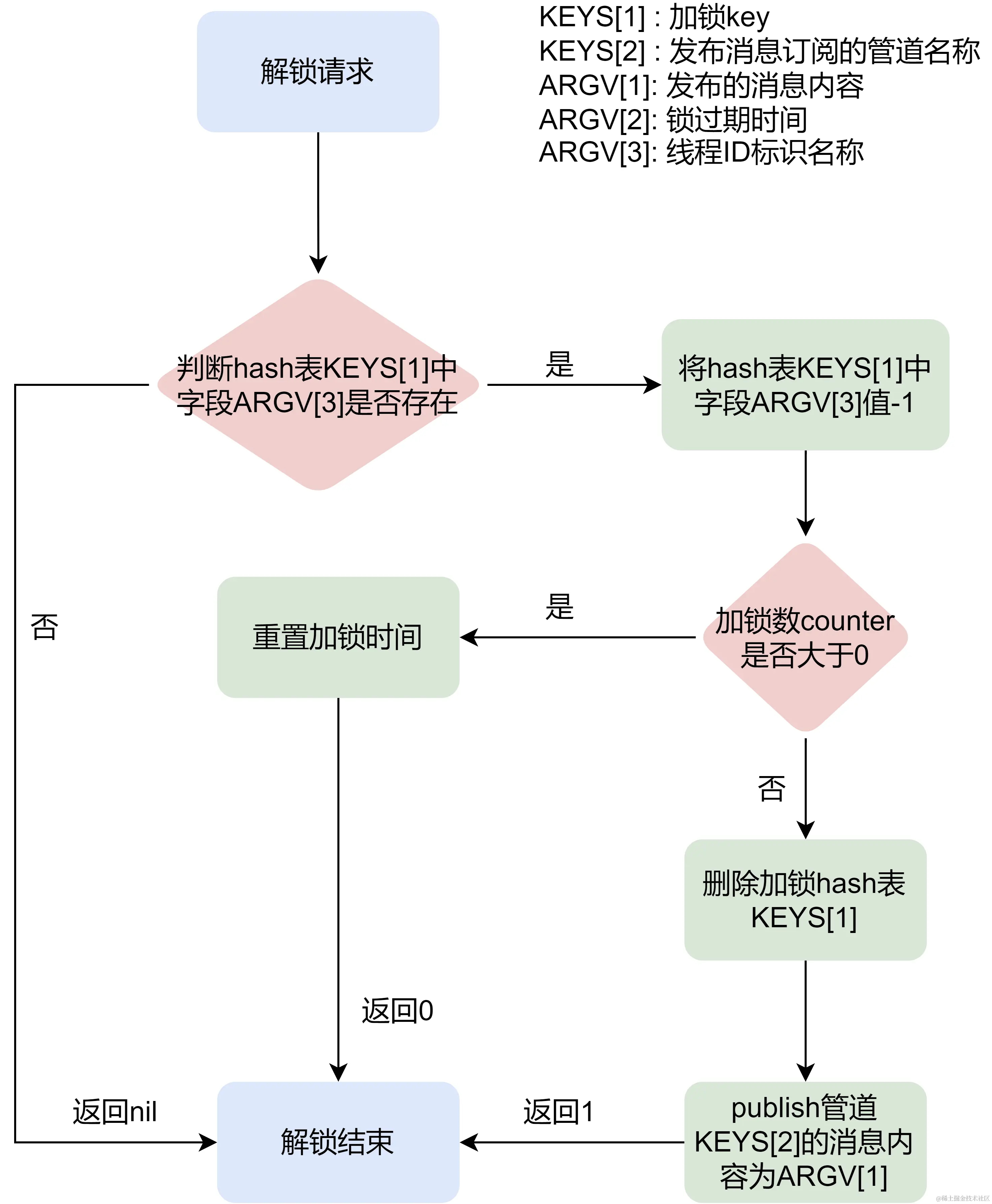 del("锁id") 把锁id删除即可以解锁成功,当锁id没有被删除时,其它线程不能加锁成功