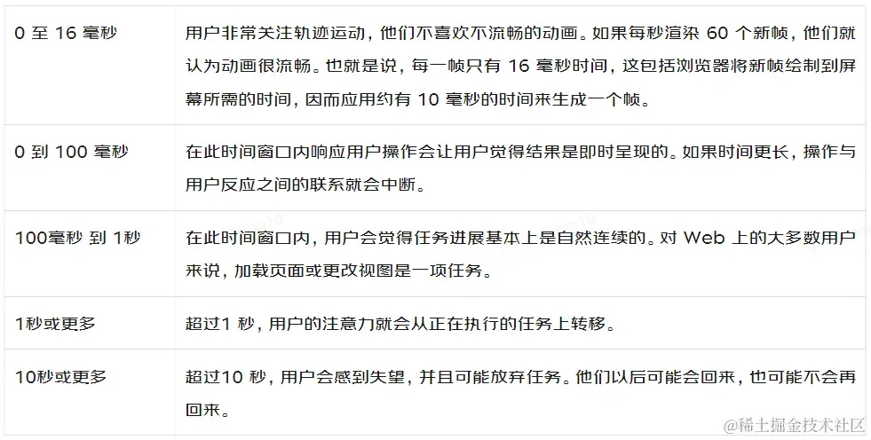 不同的用户对RAIL中的每一个都有不同的性能期望,因此性能指标是根据上下文和关于用户如何感知延迟的用户体验研究来定义的。