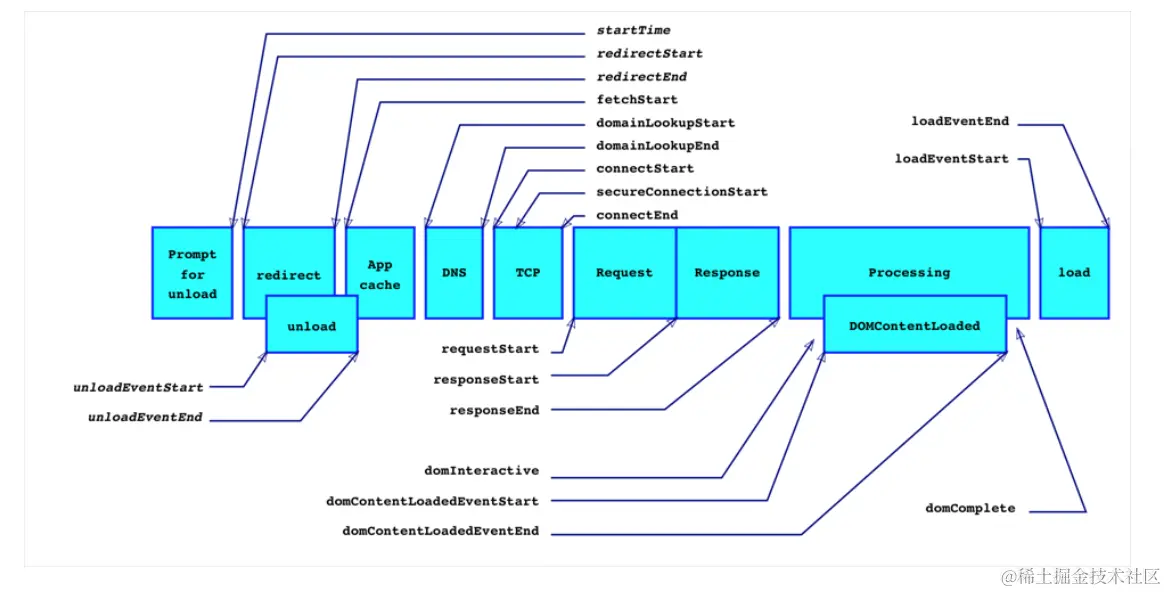 - fetchStart:浏览器准备好使用 HTTP 请求抓取文档的时间,这发生在检查本地缓存之前