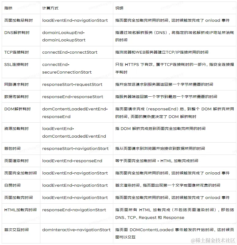 从输入url到用户可以使用页面的全过程时间统计,会返回一个PerformanceTiming对象,单位均为毫秒