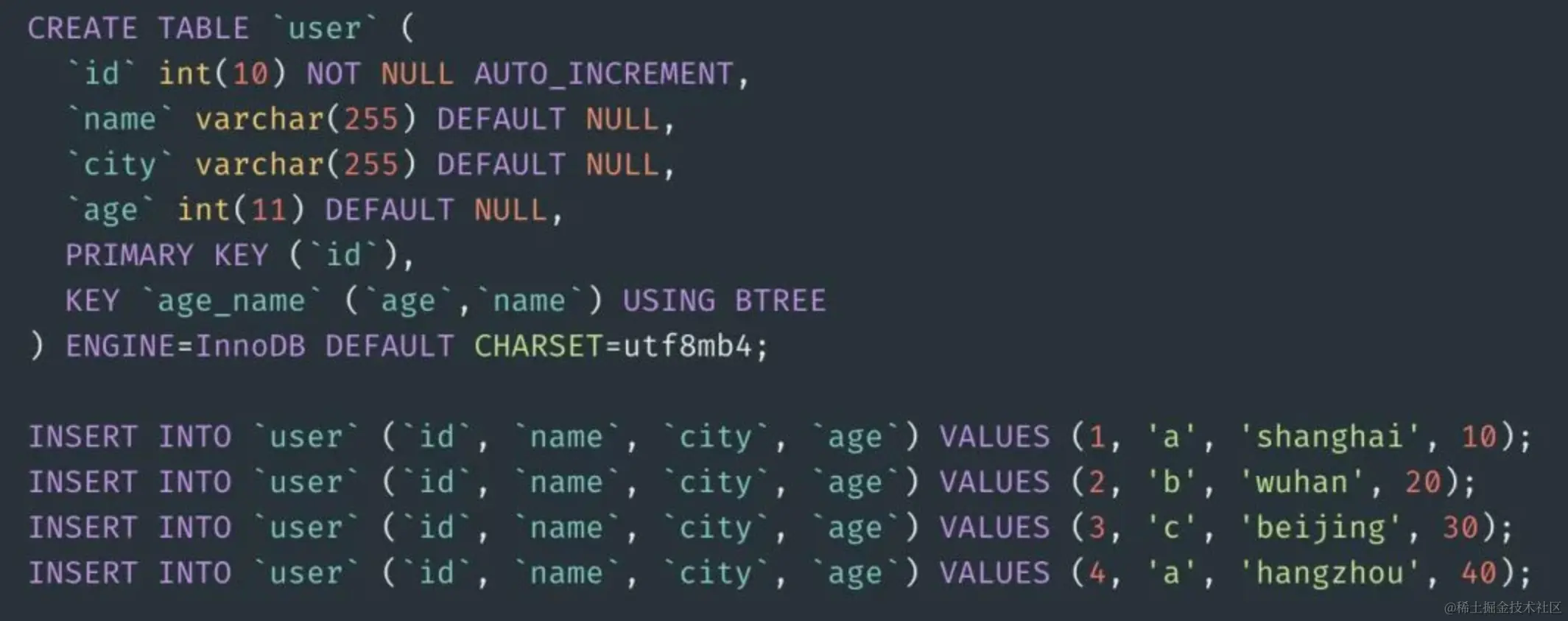 首先,我们创建一张user表,同时建立age_name的联合索引,同时插入3条测试数据。