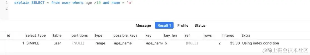 然后,我们执行查询explain SELECT * from user where age >10 and name = 'a',如下图所示,就会看见Extra中显示了Using index condition,你可能就知道了,这表示出现了索引下推了。