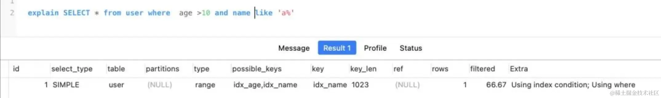 然后我们执行查询explain SELECT * from user where age >10 and name like 'a%',结果如下图。