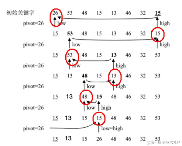 上面红框位置表示当前已经被赋值给了pivot或者其他位置,可以空出来放移动来的新元素了。我们可以看到26最终被放到了属于自己的位置上,不会再变化,而26的左右两侧可以分别再进行排序。