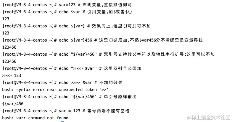 > echo $var; # 变量名前加$即为引用,输出“123”; 也可以是echo ${var},效果相同;