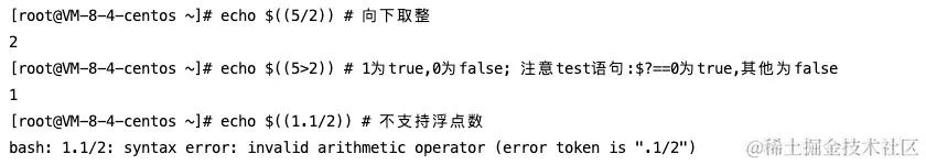 注意:shell没有浮点类型,布尔类型变量,整数运算得到还是整数(向下取整);