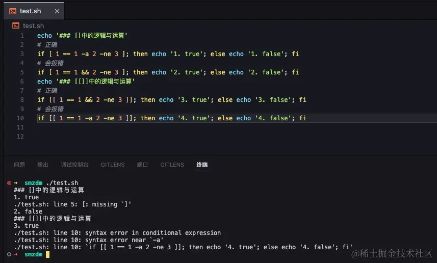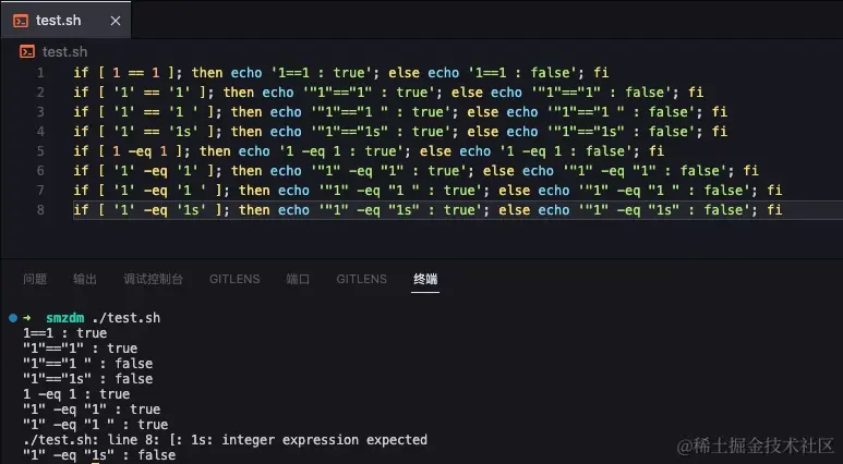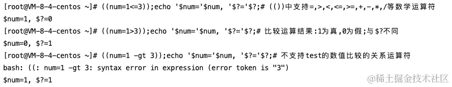 **test**的兼职语法:**(())**:(())不是专门用于test的语法,而是为方便数学运算的语法,能顺便用于数值比较(比较结果:1为真,0为假;与$?的要区分开)。**注意:**``**不能用于字符串比较以及文件测试**``。