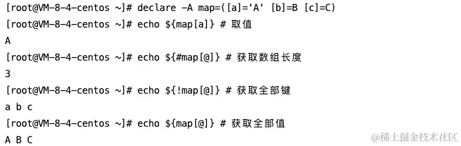 类似js中的对象)这里需要特别声明,-A 选项就是用于声明一个关联数组。