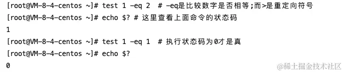 2. test 用于检查某个条件是否成立,但是它在终端不会输出任何东西;test 条件句是否通过的标准是能否正常结束(命令执行的状态码:$?为0为正常结束,否则为异常)。