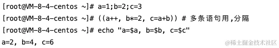 注意:(())中多语句用,而不是;分隔,最后一条语句决定整个 (()) 构造的退出状态$?以及返回值。