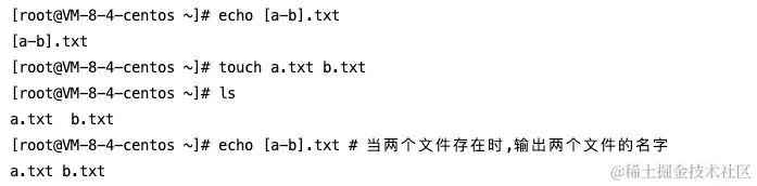 echo {a,b}.txt输出a.txt b.txt。与echo [a-b].txt区别在于,后者只输出存在的文件名(参考上面[]用法中的例子),而前者不管是不是存在此文件,永远都会输出a.txt b.txt,因为{}的字符扩展和是不是文件名没有关系。-