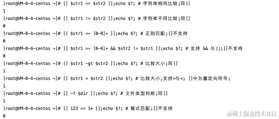 较[]来说功能更强,[[]]增加了模式匹配、逻辑运算符和高级的字符串操作,例如:正则表达式、逻辑与 &&、逻辑或 ||、字符串替换,大于>,小于<等。