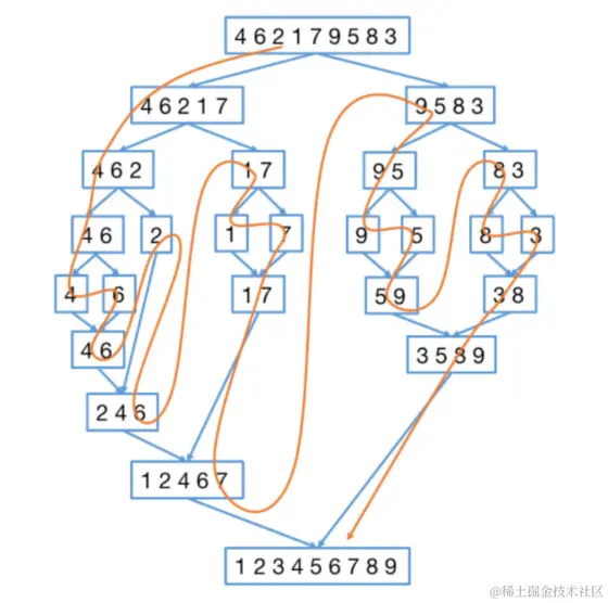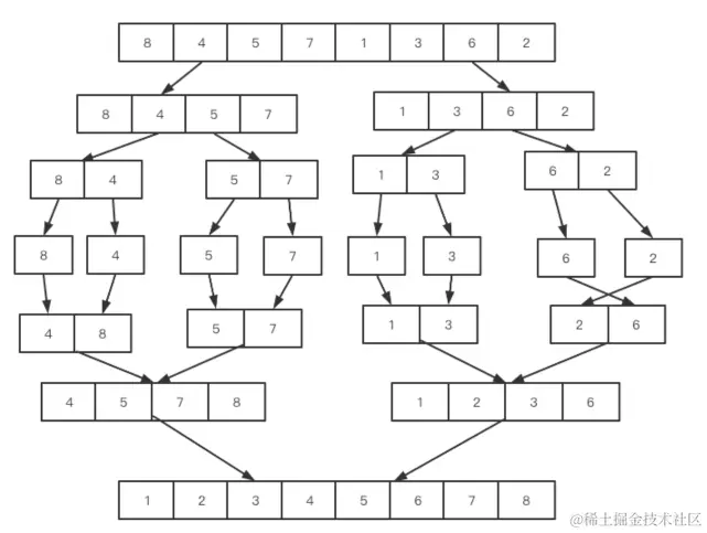 再来看看治阶段,我们需要将两个已经有序的子序列合并成一个有序序列,就是下侧的满二叉树。比如上图中的最后一次合并,要将[4,5,7,8]和[1,2,3,6]两个已经有序的子序列,合并为最终序列[1,2,3,4,5,6,7,8],这个操作与合并两个有序数组的完全一样,不同的是这里是将数组的两个部分合并。 在看一下遍历时处理元素的过程: