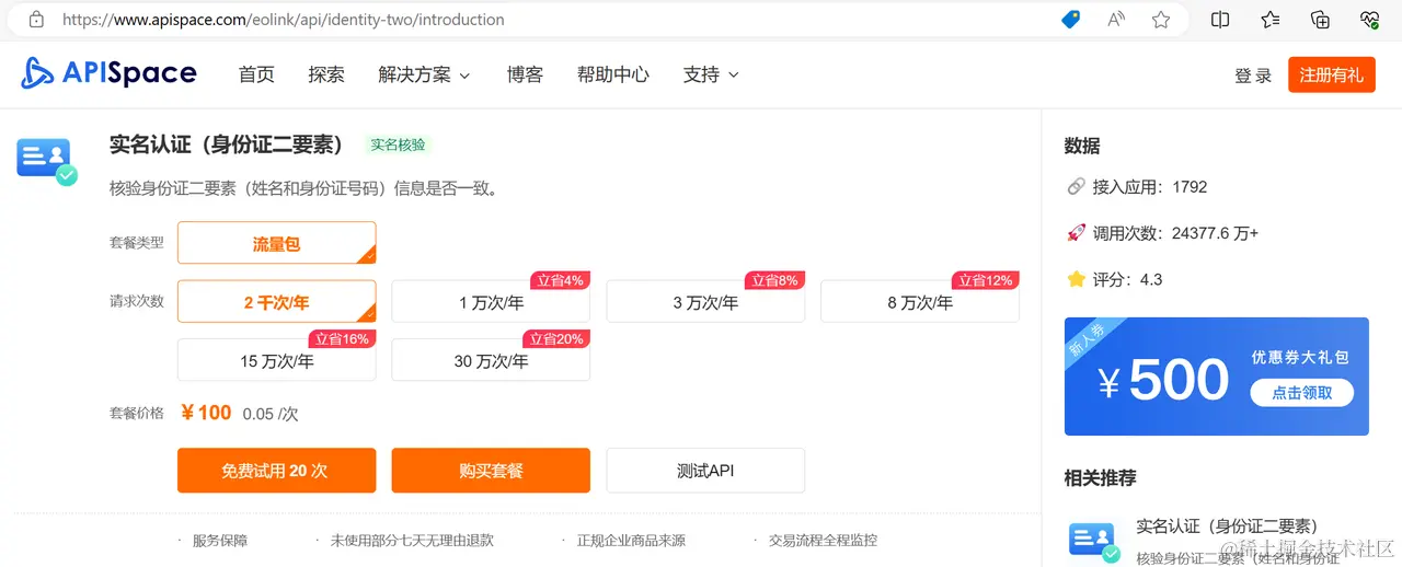 同时 APISpace 还提供了 实名认证(身份证二要素API)的接口,核验身份证二要素(姓名和身份证号码)信息是否一致。
