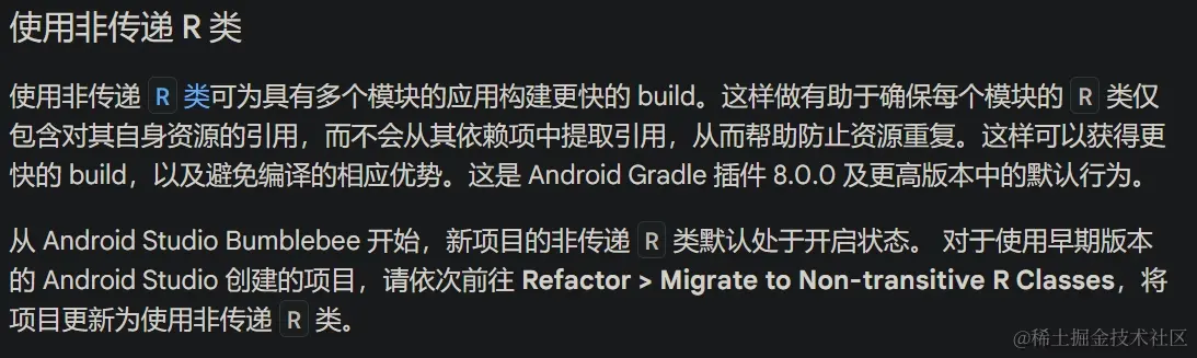Android Studio AGP8.0 模块化引入资源必须全路径问题 _Zhang張 2024-01-15 428 阅读1分钟 Android Studio AGP8.0 在模块化引入其他Module资源文件时必须要全路径(示例:包名.resource.R.string.main) 这是官方为了构建编译速度并且防止资源重复开启的设置,下面是官方解释: 非全路径引入资源,编辑gradle.properties文件开启设置: android.nonTransitiveRClass=false