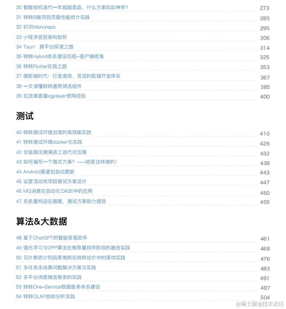 在过去的这⼀年⾥,转转研发中⼼三个公众号《转转技术》、《⼤转转FE》和《转转QA》共计发表百余篇技术⽂章,涉及各个部⻔的⼀线实践经验。在2024年春节来临之际,我们精选了其中54篇,整理制作成⼀本厚达500多⻚的电⼦书,作为新年礼物赠送给⼤家。这本电⼦书内容涉及架构运维、后端、前端、测试、算法、数据等多个⽅向,希望能对⼤家有所帮助。在这54篇文章中,你将会发现来自各个领域的专家和实践者们的独到见解和实用经验。**无论你是想了解如何优化系统架构,提升前端性能,编写高质量的后端代码,设计高效的测试策略,还是掌握算法和数据处理的技巧,都能在技术年货中找到你所需的内容。**也欢迎⼤家转给周边感兴趣的朋友们,⼀起交流,共同成⻓。