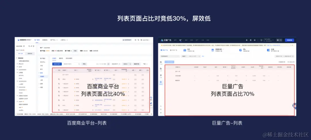 百度商业B端平台的列表模块存在性能卡顿和交互操作效率低的问题,通过全屏交互框架、创新设计交互模式和增加智能查询等举措提升列表使用体验和客户满意度。针对浏览数据场景,采用全屏沉浸模式和紧凑型UI方案提高展现行数和空间利用率。针对查找数据场景,提出组合筛选交互模式和智能查询功能。针对管理数据场景,提供多任务标签卡的交互模式。通过以上措施,希望提升列表模块的操作效率和客户满意度。
