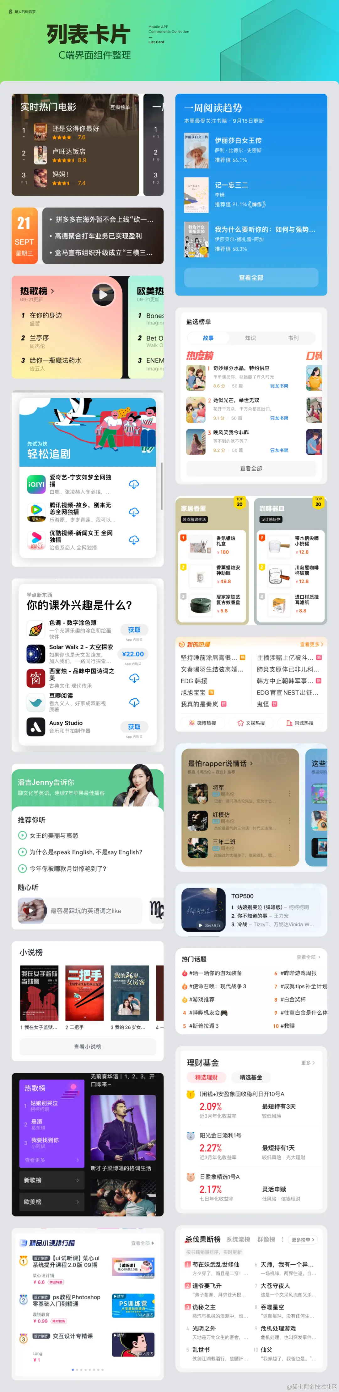 列表卡片是一种将列表和卡片相结合的组件形式,适用于内容不需要排序和需要明确排序的情况。列表卡片的内容元素包括标题、列表、卡片背景和查看详情的按钮。序号设计是有序列表卡片中的一个重要设计点。