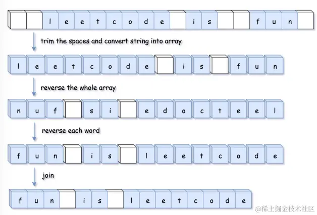 对于字符串可变的语言,就不需要再额外开辟空间了,直接在字符串上原地实现。在这种情况下,反转字符和去除空格可以一起完成。